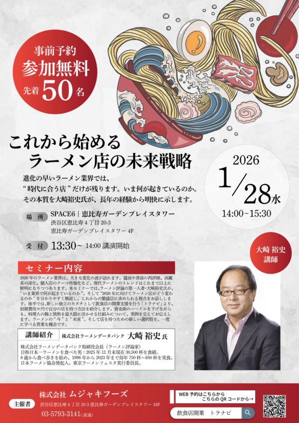 2026年1月28日(水)、恵比寿ガーデンプレイスタワーにて、これからラーメン開業を目指す方や既存店の経営戦略見直しを検討されている方に向けた特別セミナーを開催いたします。株式会社ラーメンデータバンク取締役会長の大崎裕史氏を講師に迎え、変革期を迎えるラーメン業界の最新動向と実践的な経営戦略をお伝えします。